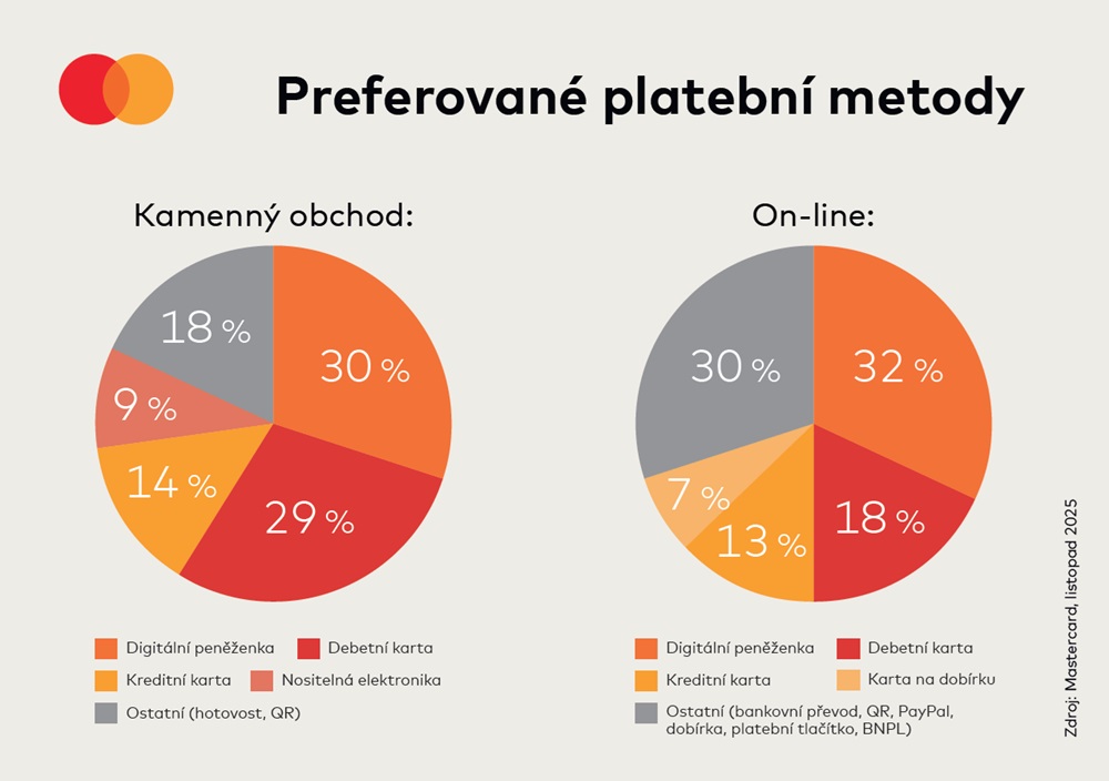Digitální platby se v Česku staly běžným standardem každodenního nakupování. Devět z deseti zákazníků preferuje platbu kartou, mobilem nebo nositelnou elektronikou. V kamenných obchodech dává digitálním metodám přednost 85 procent lidí, v online prostředí dokonce 95 procent. Hotovost a další alternativní platební metody zůstávají spíše doplňkem než první volbou. Vyplývá to z aktuálního průzkumu společnosti Mastercard zaměřeného na platební chování spotřebitelů v Česku.